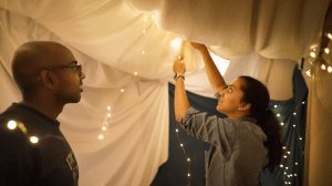 Build a cozy fort with blankets and pillows in your living room. Snuggle inside with popcorn and your favorite films or a series you’ve been meaning to watch together.